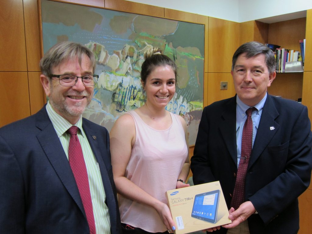Ainhoa Muixí, que estudia a la Facultat de Lletres, ha rebut la tauleta tàctil de mans del rector, Josep Anton Ferré, i del vicerector de Política Científica i de Recerca, Josep Manel Ricart, en un acte al Rectorat.
