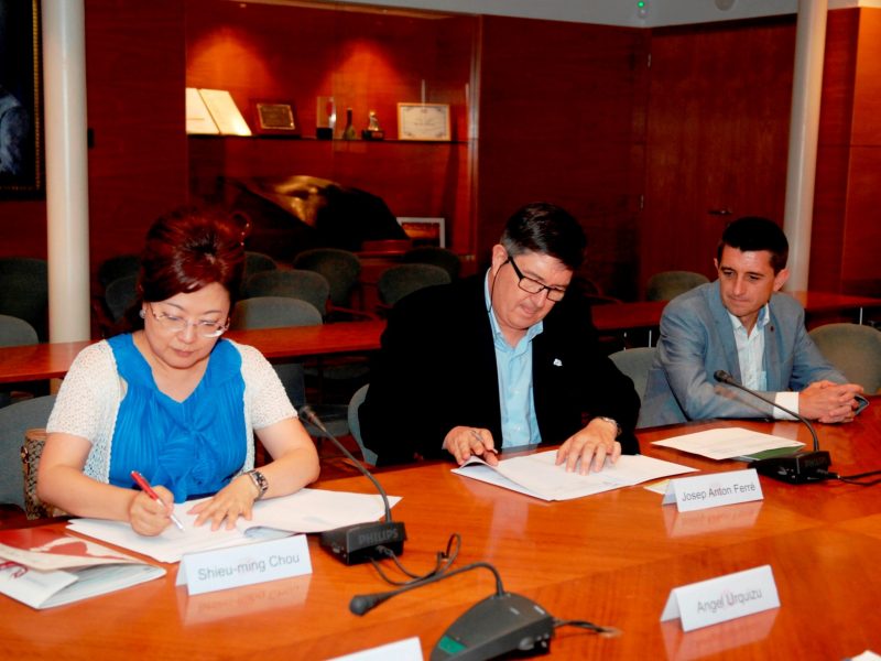 La Universitat continua ampliant i intensificant les relacions acadèmiques amb universitats de la Xina. S’ha signat un nou conveni marc de col·laboració, ara entre la URV i Wenzao Ursuline University, de Taiwan. El dilluns, 27 de juliol, l’han firmat la rectora Shieu-Ming Chou i el rector Josep Anton Ferré, en un acte al rectorat. Alumnes d’aquesta universitat vindran a la URV en el curs 2015-16 per seguir el curs universitari de Llengua Espanyola