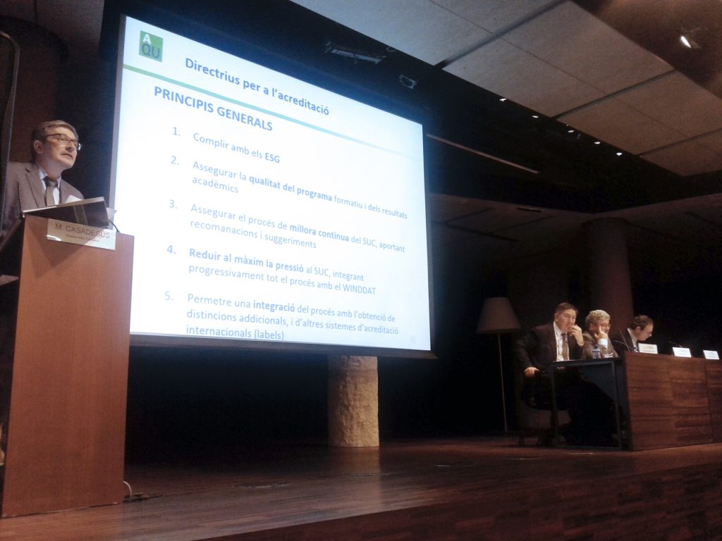 El presidente de la AQU, Josep Joan Moreso, el rector de la URV, Josep Anton Ferré, en representación de las universidades catalanas; el director general de Universidades, Lluís Jofre, en representación del Gobierno de la Generalitat, y el director de AQU Catalunya, Martí Casadesús, han entregado los certificados de acreditación de las titulaciones en las universidades el jueves 21 de mayo en un acto celebrado en el Auditorio de La Pedrera, en Barcelona.
