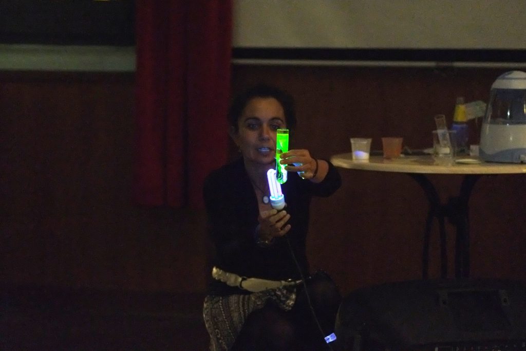 Durant la xerrada, Mar Reguero ha fet alguns experiments per mostrat, per exemple, el petit que és l’espectre de llum visible pels humans en comparació amb els rajos ultraviolats i infrarojos. A més, ha explicat que l’ull interpreta els colors a partir dels tres colors primaris: cian, groc i magenta. També ha tractat de la diferència entre la fluorescència i la fosforescència. La fluorescència és un fenomen físic mitjançant el qual algunes substàncies absorbeixen energia, a partir de llum ultraviolada, per emetre-la novament en forma de llum. En canvi, amb la fosforescència, les substàncies absorbeixen l’energia i l’emmagatzemen per emetre-la posteriorment. I ho ha exemplificat amb experiments.