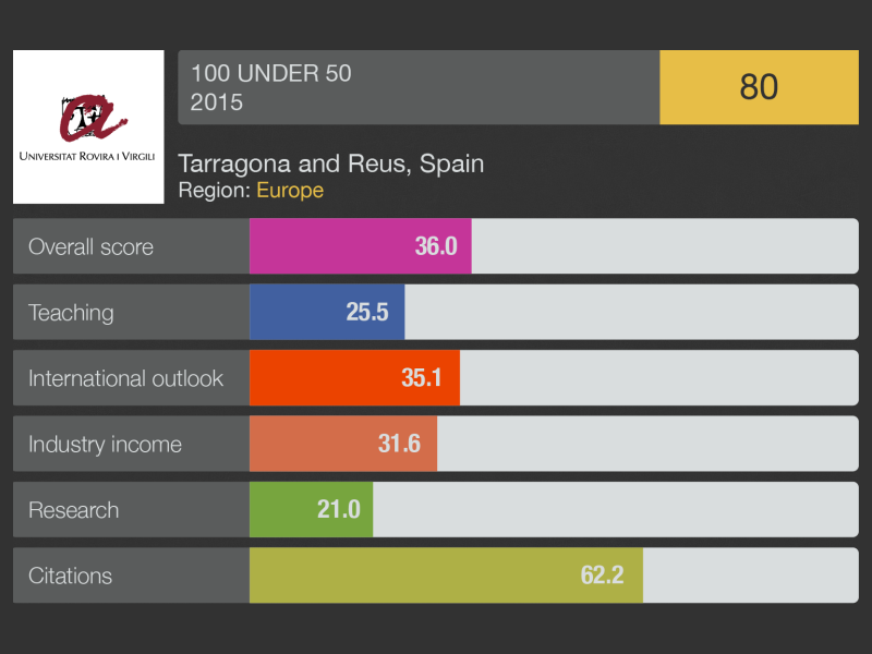 El rànquing 100 under 50, que elabora la revista "Times Higher Education", ha situat la URV en 80a posició en la llista de les 100 millors universitats del món de menys de cinquanta anys d’antiguitat. És el segon cop consecutiu que la URV forma part de les cent més valorades en aquest rànquing, que es fa des del 2012